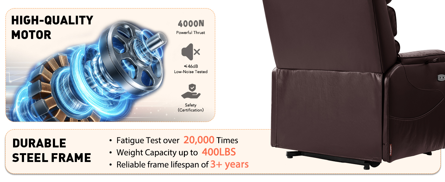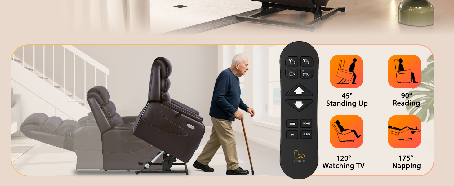POWER LIFT CHAIR:Our lift recliner chair can be easily operated via handheld controller with one touch reset function. It offers multiple reclining modes including memory mode, sleep mode, and TV mode, while allowing independent adjustment of backrest and footrest positions.
