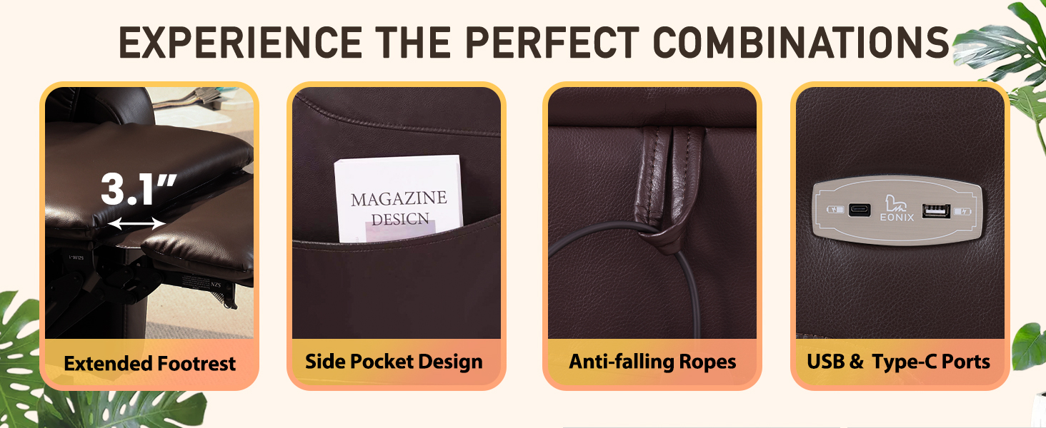 MULTIFUNCTIONAL SOFA CHAIR:Our power lift chair fabrics are OEKO-TEX certified and very comfortable! The wooden frame of the Power Lift Chair is FSC certified. In addition, our power lift chair contains dual side pockets for easy access and power recliner is equipped with a USB port for easy charging of smart electronic devices. And it includes two cup holders that allow users to keep beverages within reach; for your utmost convenience.